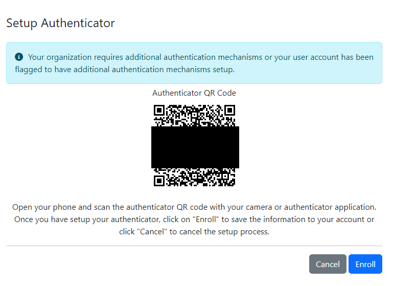 If the user selects the "Setup Authenticator", they will be redirected to the "Setup Authenticator" page where they can enroll their authenticator.