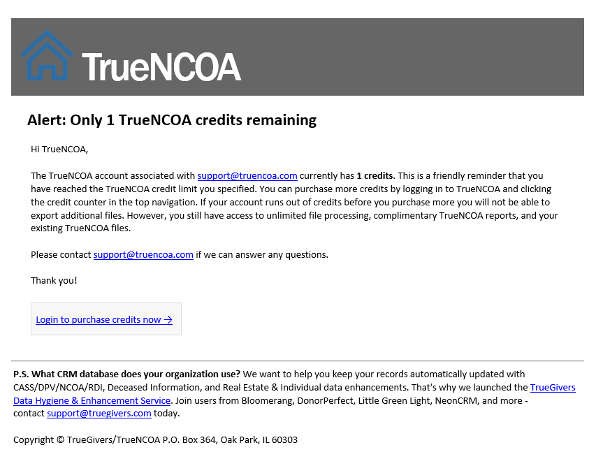 For example, if you want to receive an email notification when your TrueNCOA account has 1 credit, enter the number 1.