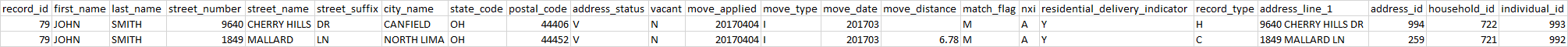Sample of how an updated address is returned. Note: We did not include all export fields in our example.
